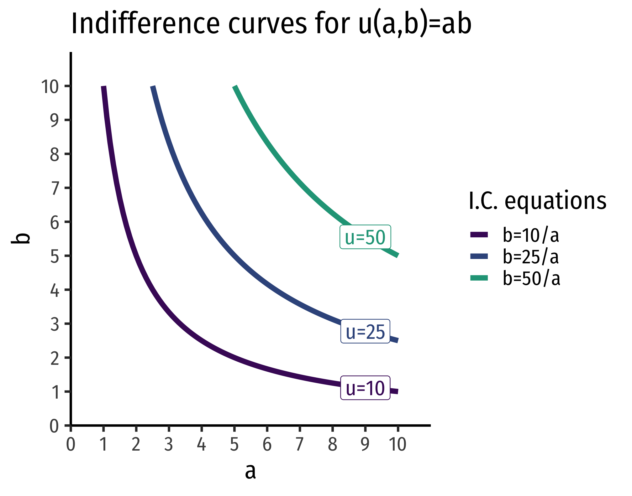 This is the general equation for all indifference curves of this utility function: each utility level (value of \(k)\) can be graphed as an indifference curve with that equation. Thus, for example, for a utility level of \(10\), the equation for that indifference curve is \[b=\frac{10}{a}\].
