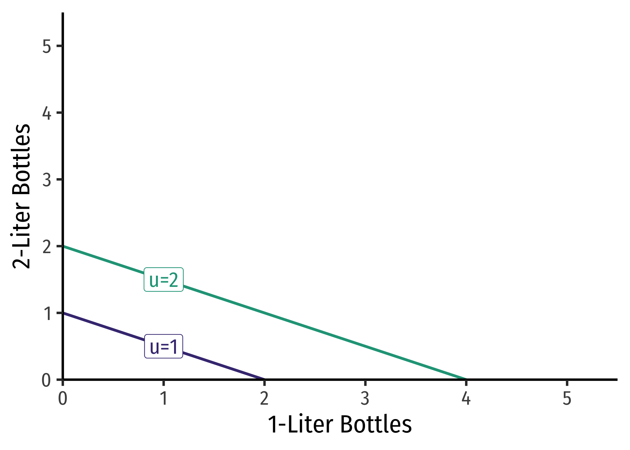 Consider 1-Liter bottles of Coke \(L_{1}\) and 2-Liter bottles of Coke \(L_{2}\). You should always be willing to substitute between one 2-Liter bottle and two 1-Liter bottles.
