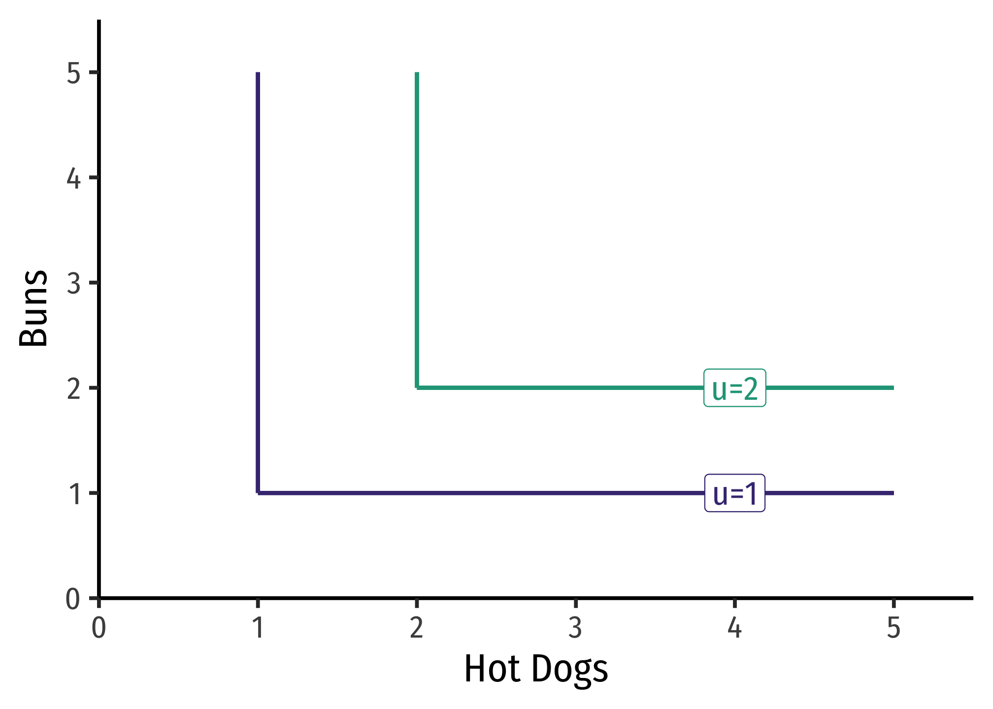 Having 2 hot dogs and 3 buns only yields a utility of 2. Having 3 hot dogs and 2 buns also only yields a utility of 2.