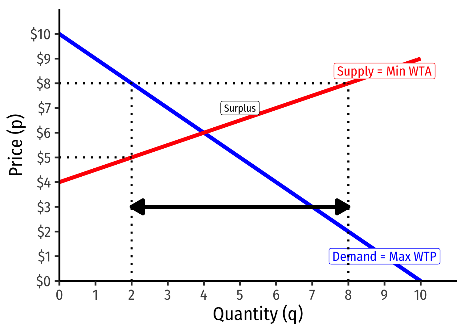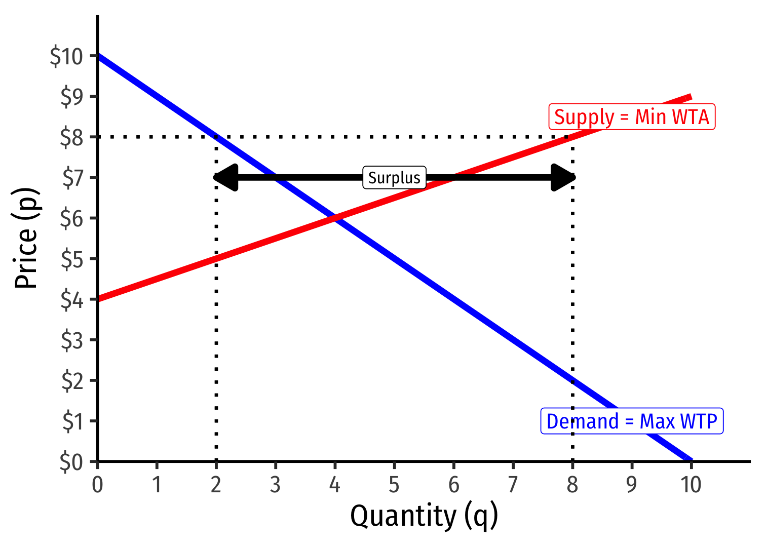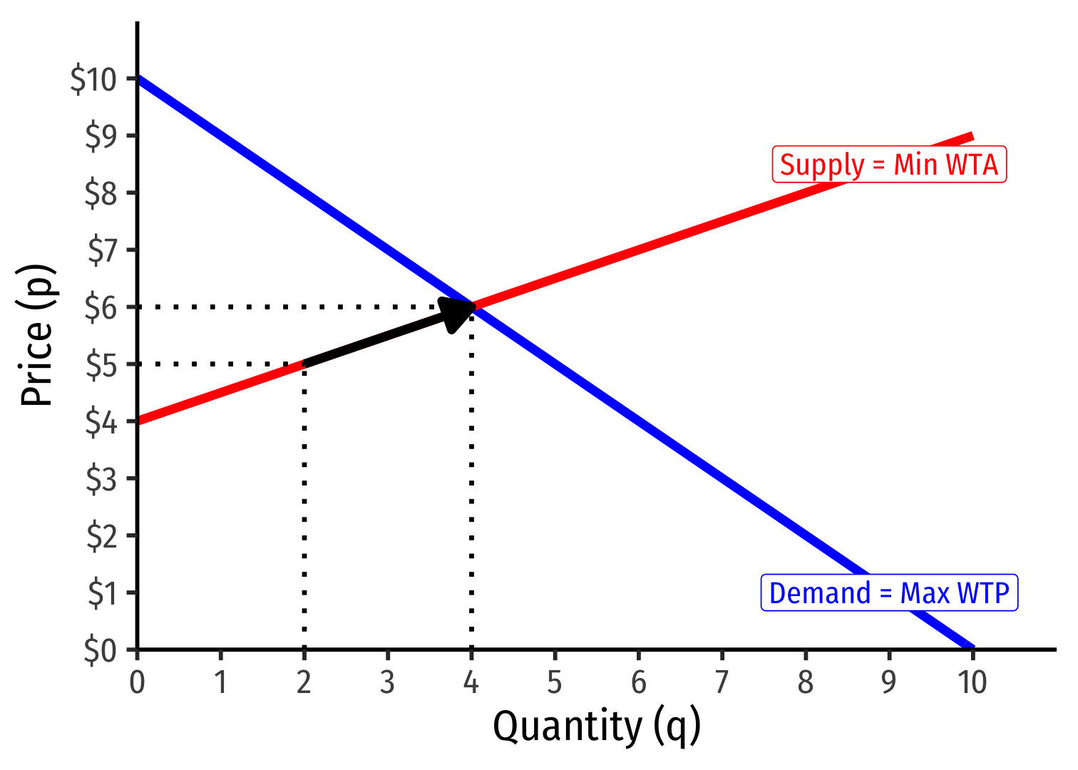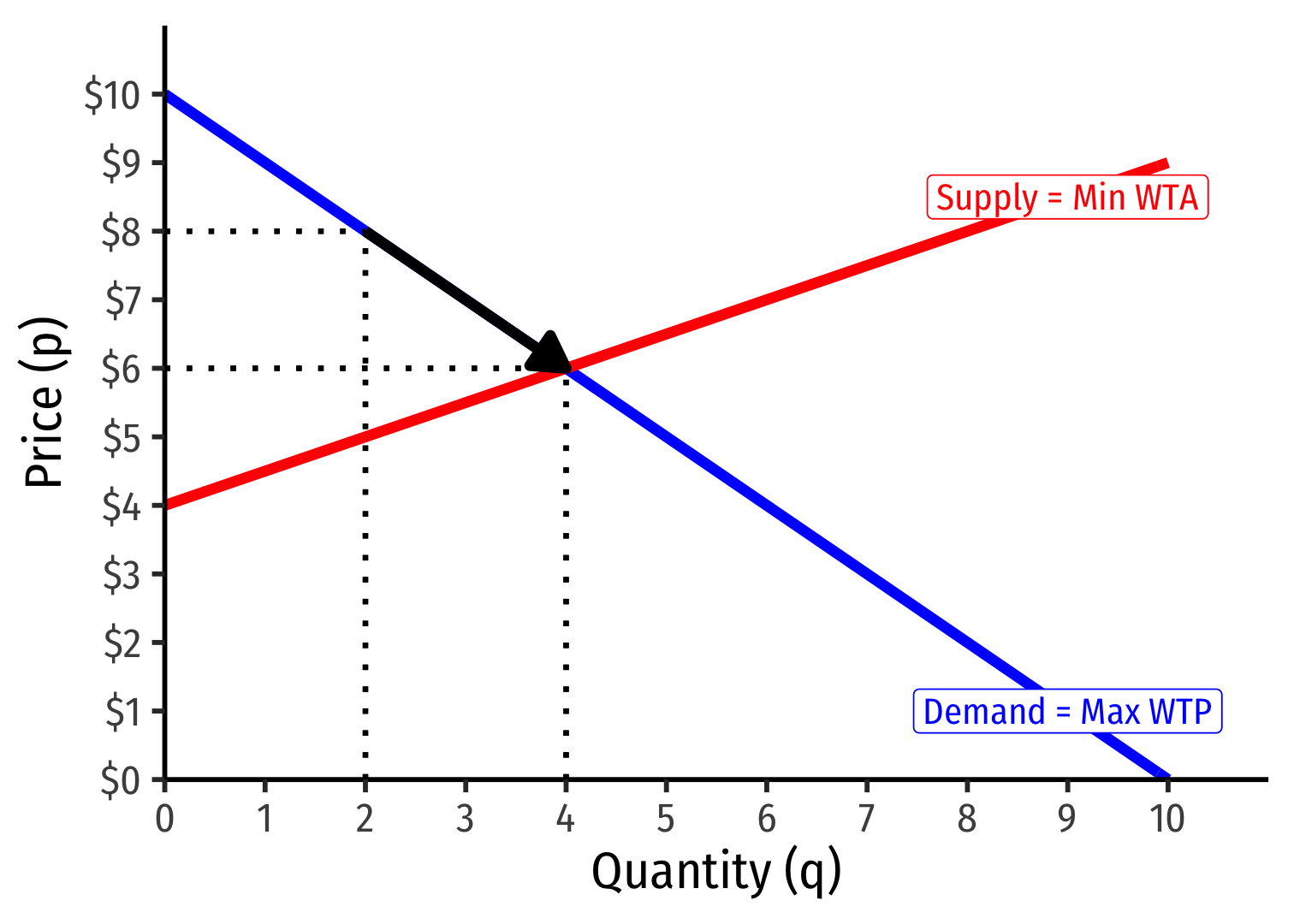 Market-clearing (equilibrium) quantity exchanged (q∗): 4