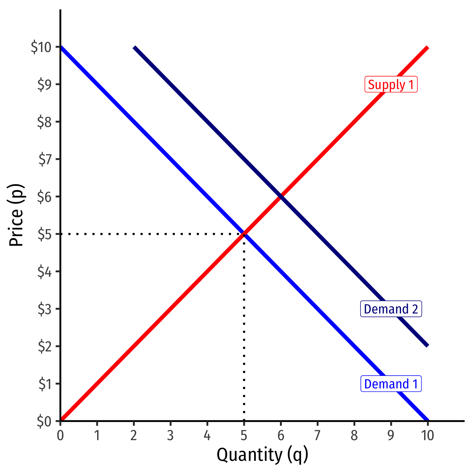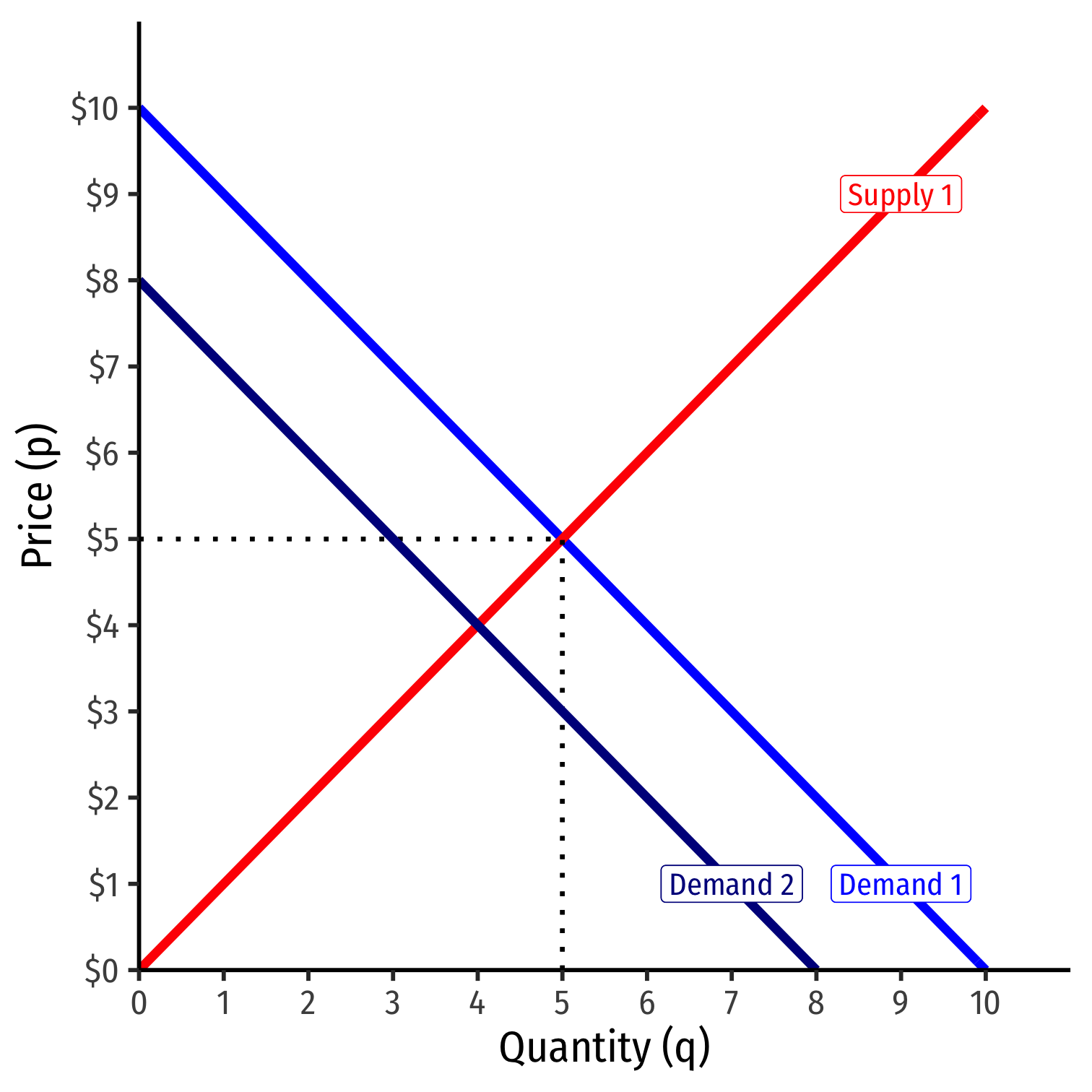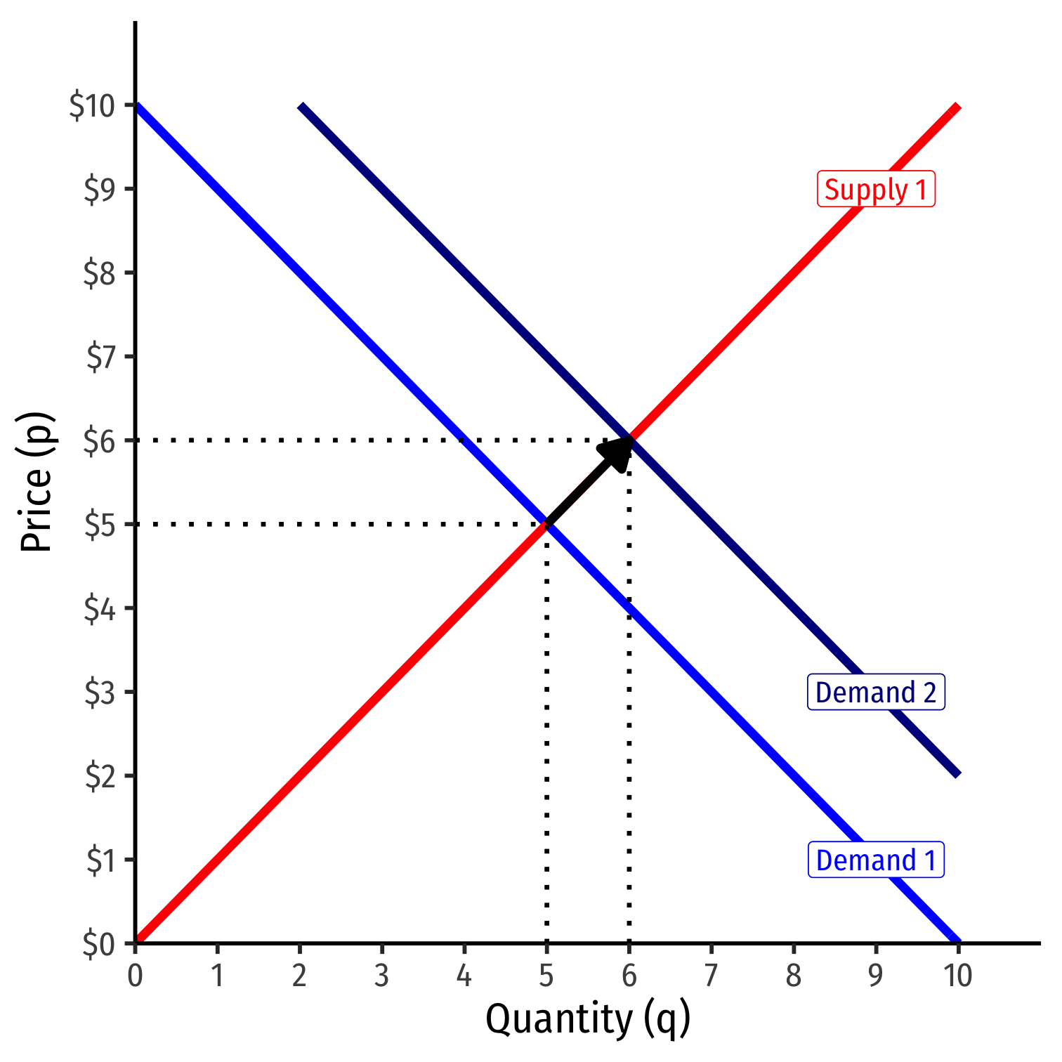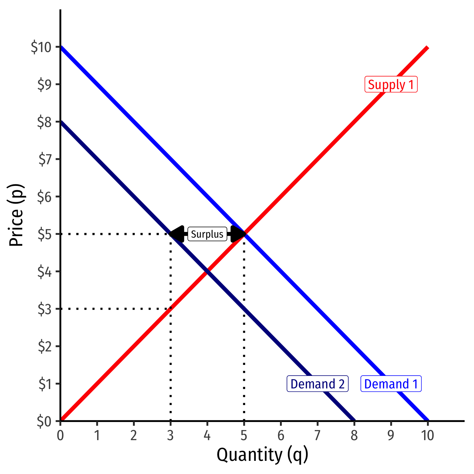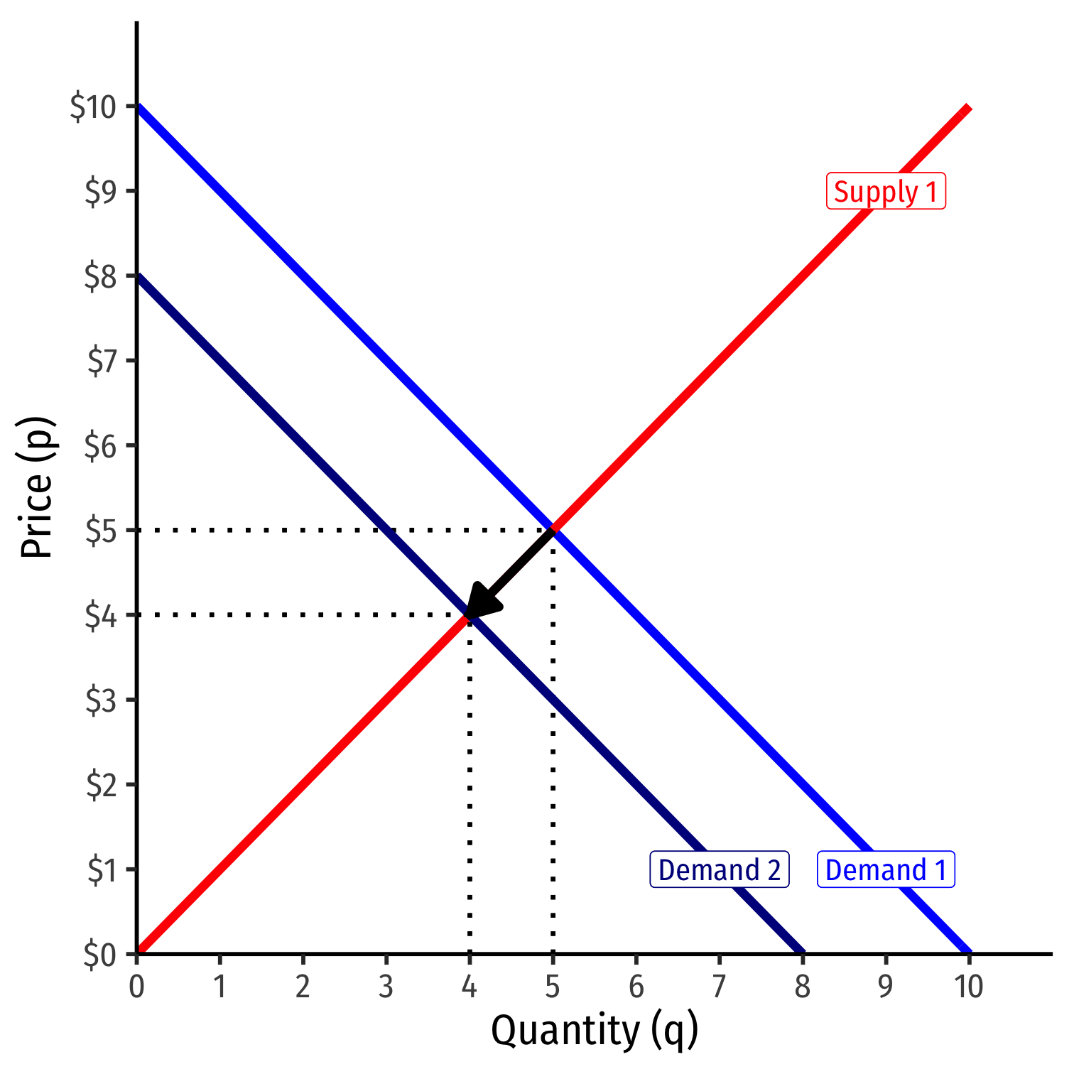 If the market price (p) changes (perhaps because supply changes), that results in a change in quantity demanded (qD)