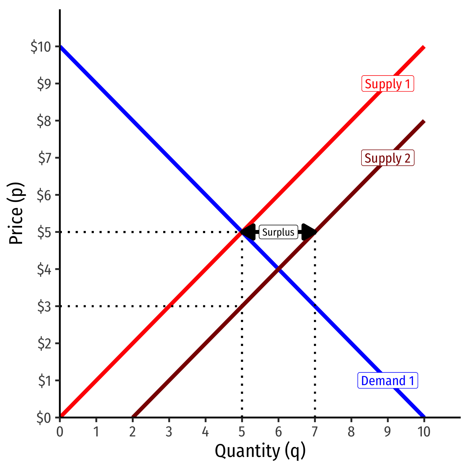 At the original market price, a surplus! (qD<qS)